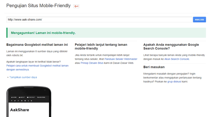Alat ini bekerja, Anda akan melihat pesan berwarna hijau yang mengatakan Mengagumkan! Laman ini mobile-friendly. dan jika situs Anda tidak lulus dalam tes ini maka akan muncul pesan berwana merah yang mengatakan laman ini tidak mobile-friendly.