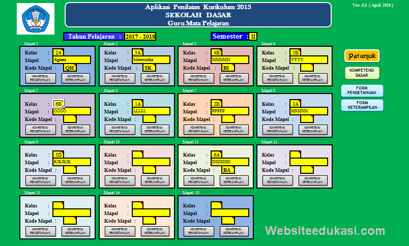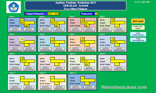 Aplikasi Penilaian Kurikulum 2013 Guru Mata Pelajaran SD versi 0.3 ini di share melalui grup facebook Komunitas Guru Matematika Indonesia. Jika bapak/ ibu guru mapel khusunya jenjang SD/MI yang bingung dalam penggunaan aplikasi penilaian tersebut, bapak ibu dewan guru bisa mempelajarinya melalui petunjuk penggunaan.