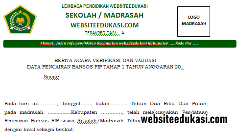 Websiteedukasi.com – Berita Acara Verifikasi Dan Validasi Data Pencairan Bansos Program Indonesia Pintar (PIP) Jenjang MI, MTs, MA.
