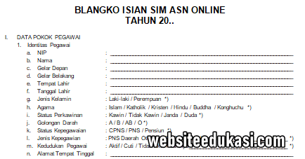 Blanko Sistem Informasi Manajemen Aparatur Sipil Negara (SIM ASN) Online Guru ini untuk mengolah kenaikan gaji berkala secara otomatis, isian data yang perlu di isi meliputi data pokok pegawai, riwayat kepegawaian, riwayat pendidik, riwayat keluarga. Selain bapak/ibu Guru Pegawai Negeri Sipil (PNS) mengisi data ASN, juga melapirkan dokumen yang diantaranya;