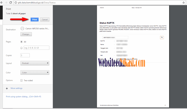 4. Untuk mencetak NUPTK, ketikan CTRL + P. lalu tekan Print.