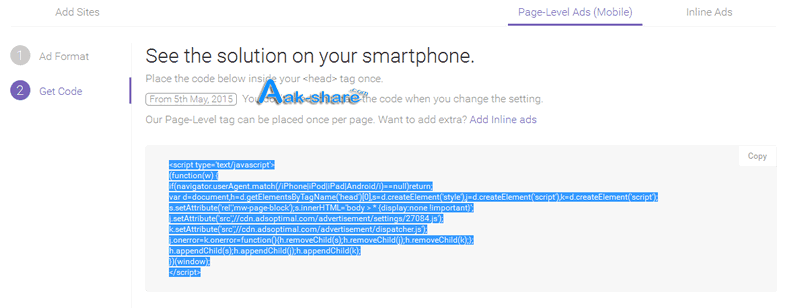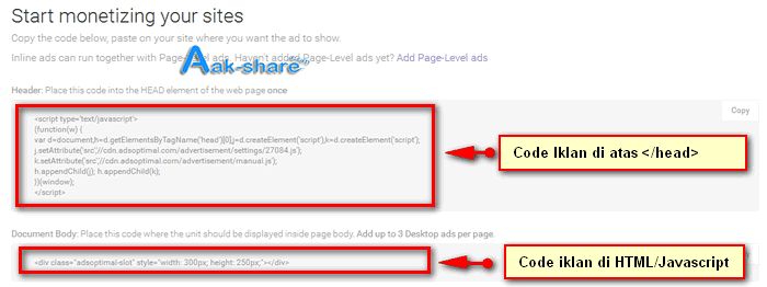 4. langkah berikutnya, Anda copy kode iklan dan psangkan di atas </head> atau dibawah kode <head>.
