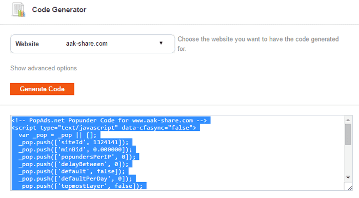 Note : kamu juga bisa mengcopy kodenya di email approved PopAds, karena tema dari PopAds selain memberi informasi persetujuan tapi juga memberikan script code iklan.
