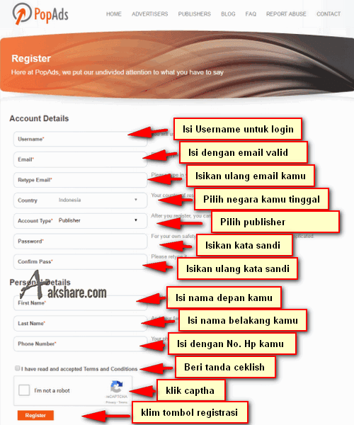 Persyaratan mendaftar di Pop Ads :