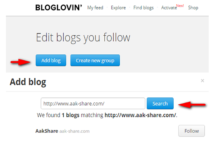 - Langkah berikutnya Anda Pergi ke halaman Subcribtions, lalu klik tombol Add blog, masukkan URL Blog Anda, kemudian klik tombol search untuk memastikan alamat blog Anda ada atau tidak.