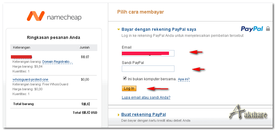 Sepuluh : ditahap ini isikan email Anda dan sandi paypal, maka secara otomatis akan ditransfer langsung ke NameCheap, dengan ketentuan jika saldo Anda mencukupi saat pembayaran.