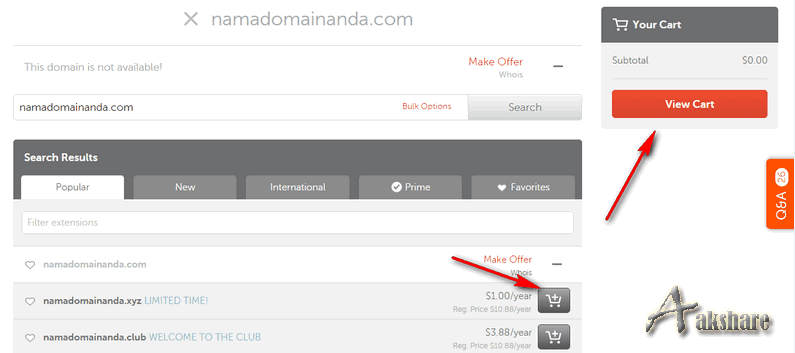 Ketiga : Berikutnya akan muncul beberapan nama domain yang tersedia untuk nama Domian Anda, pilih sesuai yang Anda kehendaki, lalu klik keranjang belanja dan klik pada View Cart
