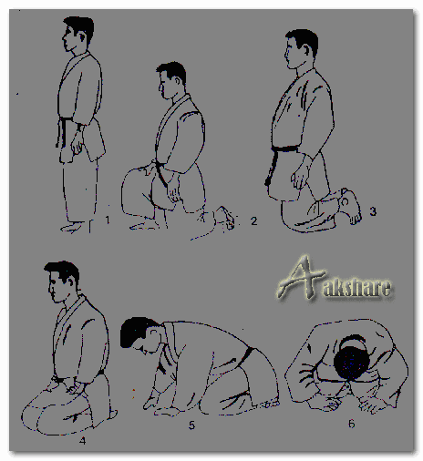 Kelima ; bungkukkan badan kedepan sambil kedua telapak tangan di letakkan di atas Tatami. Waktu membungkuk kedepan jarak dahi dengan Tatami + 30 cm, jari – jari kedua tangan saling serong berhadapan dengan jarak + 10 cm dan pinggul jangan terangkat.