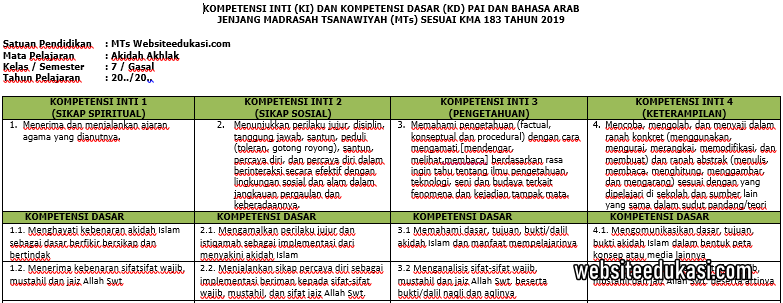 Websiteeduaksi.com – Kompetensi Inti (KI) dan Kompetensi Dasar (KD) Mata pelajaran Akidah Akhlak Pada Madrasah Tsanawiyah (MTs) diatur dalam KMA 183 Tahun 2019 tentang Kurikulum PAI dan Bahasa Arab.