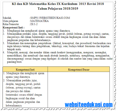 Kompetensi inti (KI) dan Kompetensi Dasar (KD) Matematika Kelas IX k13 revisi 2018 adalah merupakan tingkat kemampuan untuk mencapai standar kompetensi lulusan yang harus dimiliki seorang peserta didik pada setiap tingkat kelas. KI dan KD merupakan salah satu administrasi guru yang juga wajib di dimiliki oleh guru.