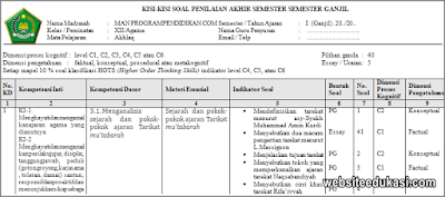 Untuk memudahkan peserta didik/ siswa jenjang MA Kelas 12 belajar sebelum menghadapi Ulangan Akhir Semester (UAS/ PAS) Ganjil Mapel Akhlak di tahun ajaran 2019/2020 dengan mempelajari kisi-kisi soal Penilian Akhir Semester ganjil ini.