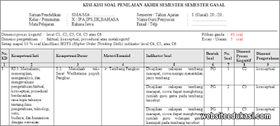 Pada postingan ini saya akan share Kisi-Kisi Soal Penilaian Akhir Semester (PAS)/ Ulangan Akhir Semester (UAS) Mata Pelajaran Bahasa Jawa Kelas X jenjang SMA/MA Semester 1 Kurikulum 2013 Tahun Pelajaran 2019/2020 yang tentunya bisa anda unduh secara gratis.