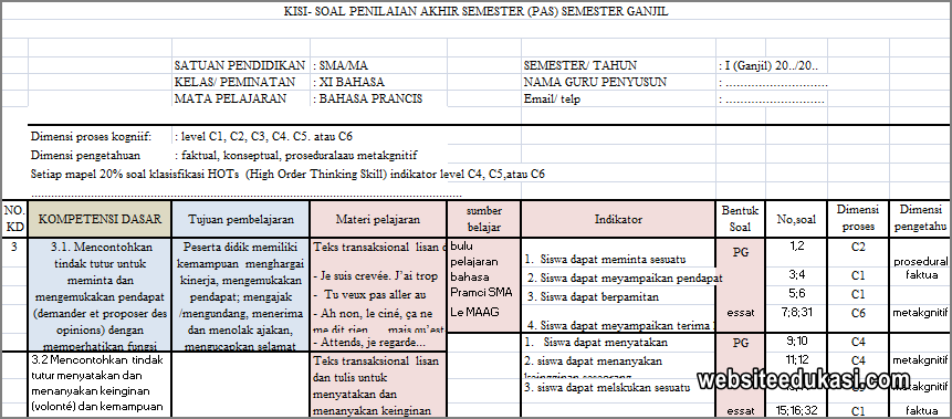 Websiteedukasi.com – Kisi-Kisi PAS / UAS Bahasa Prancis Kelas 11 Tahun 2019/2020. Kisi-kisi Soal Penilaian Akhir Semester Bahasa Prancis Kelas XI merupakan kerangka dasar yang dibuat untuk tindak lanjut dalam penyusunan soal ujian. Kisi-kisi soal disusun dengan tujuan untuk memberi gambaran tentang bentuk soal dan materi yang akan diujikan. Dengan adanya Kisi-kisi ini peserta didik dapat mempelajari materi pelajaran yang akan di ujikan.
