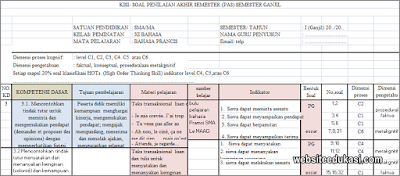 Kisi-kisi PAS Bahasa Prancis Kelas XI K13 tahun 2019/2020 ini di buat dengan menggunakan Microsoft Word, dengan demikian bapak dan ibu dewan guru dapat dengan mudah mengeditkan untuk disesuaikan dengan materi-materi yang sudah di sampaikan kepada siswa. Kisi-kisi ini dapat dijadikan sebagai referensi dalam pembuatan kisi-kisi soal PAS Bahasa Prancis Kelas 11 pada tahun ajaran 2019/2020.