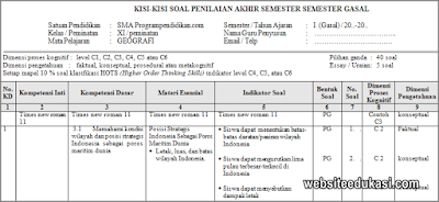 Pada postingan ini saya akan share Kisi-Kisi Soal Penilaian Akhir Semester (PAS)/ Ulangan Akhir Semester (UAS) Mata Pelajaran Geografi Kelas XI jenjang SMA/MA Semester 1 Kurikulum 2013 Tahun Pelajaran 2019/2020 yang tentunya bisa anda unduh secara gratis.