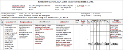 Websiteedukasi.com – Kisi-Kisi PAS / UAS Kimia Peminatan Kelas 12 Tahun 2019/2020. Kisi-kisi Soal Penilian Akhir Semester Kimia Peminatan Kelas XII merupakan kerangka dasar yang dibuat untuk tindak lanjut dalam penyusunan soal ujian. Kisi-kisi soal disusun dengan tujuan untuk memberi gambaran tentang bentuk soal dan materi yang akan diujikan. Dengan adanya Kisi-kisi ini peserta didik dapat mempelajari materi pelajaran yang akan di ujikan.