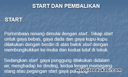 Websiteedukasi.com – Materi Start dan Pembalikan Renang ini di buat dengan menggunakan aplikasi Microsoft berbasis Power Point yang bisa anda unduh secara gratis.