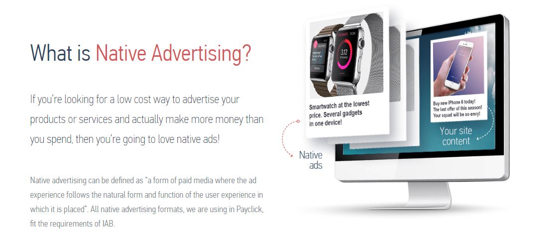 PayClick merupakan platform native advertising yang menggunakan algoritma khusus dalam menjalankan native advertising. PayClick memadukan iklan dengan konten situs secara natural, sehingga tidak mengganggu aktivitas browsing para audience yang mengunjungi situs.