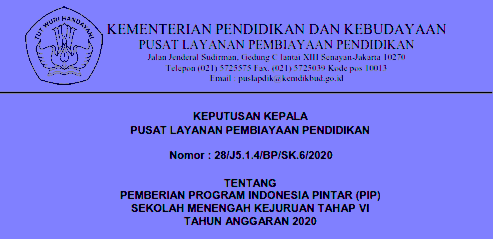 Websiteedukasi.com – Pusat Layanan Pembiayaan Pendidikan Kemendikbud telah mengeluarkan Surat Keputusan (SK) Kepala Puslapdik Nomor 28/J5.1.4/BP/SK.6/2020 tentang Pemberian Program Indonesia Pintar (PIP) Sekolah Menengah Kejuruan Tahap VI Tahun Anggaran 2020.