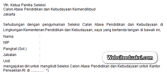 Websiteedukasi.com – Surat Lamaran Calon Atase Pendidikan dan Kebudayaan (Kemendikbud) Tahun 2019. Sehubungan dengan pengumuman Seleksi Calon Atase Pendidikan dan Kebudayaan di Lingkungan Kementerian Pendidikan dan Kebudayaan pada postingan ini kami akan membagikan format surat lamaran, format surat izin mengikuti seleksi Atase, dan format surat pernyataan keaslian dokumen.