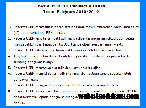 Demikian Tata Tertib Peserta Ujian Sekolah Berstandar Nasional (USBN) Jenjang SD/MI, SMP/MTs, SMA/MA, SMK/MAK Tahun 2019 yang dapat saya bagikan, semoga bermanfaat.