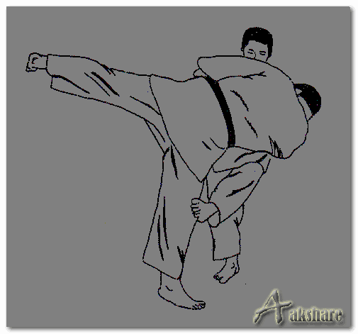 Setelah kkeseimbangan lawan badan uke kearah samping kanan depan di hilangkan, topanglah dengan telapak kaki kiri di bawah tempurung lutut kanan Uke lalu lemparlah melalui lutut itu. Teknik pelaksanaannya adalah sebagai berikut …