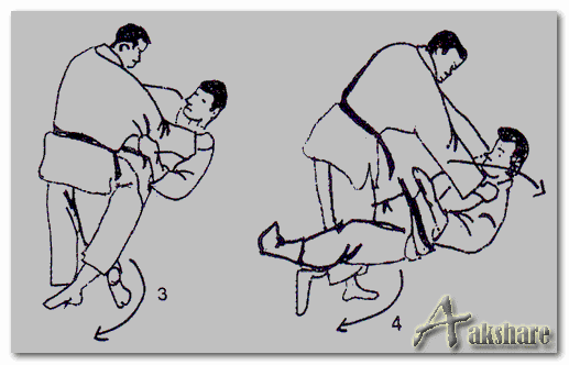 3, 4. Sebelum uke selesai melangkah dan meletakkan telapak kakinya pada tatami, maka dengan cepat Tori menyelipkan kaki kanannya ke belakang keki Uke (belakang lutut kaki Tori terhadap belakang lutut Uke) kemudian jepitlah/sabitlah dengan suatu gerakkan lingkaran besar ke serong kanan belakang Tori.