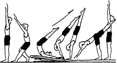 Kesemuaannya harus melalui sikap terlentang dengan mengangkat kedua kaki menuju arah belakang, hingga garis vertikal sikap diatas mata anak (yang tidur terlentang) kaki disentakkan keatas, dan pula saat yang sama kedua tangan yang bertumpu di sisi kedua telinga menolak badan dengan kuat, sehingga terjaidi Hand stand.